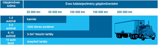• az AdBlue fogyasztás az üzemanyag fogyasztás 3-4%-a, ha az Euro 4 előírásoknak megfelelő károsanyag kibocsátás a követelmény. Az Euro 5 esetén az AdBlue fogyasztás 5-7 %-os